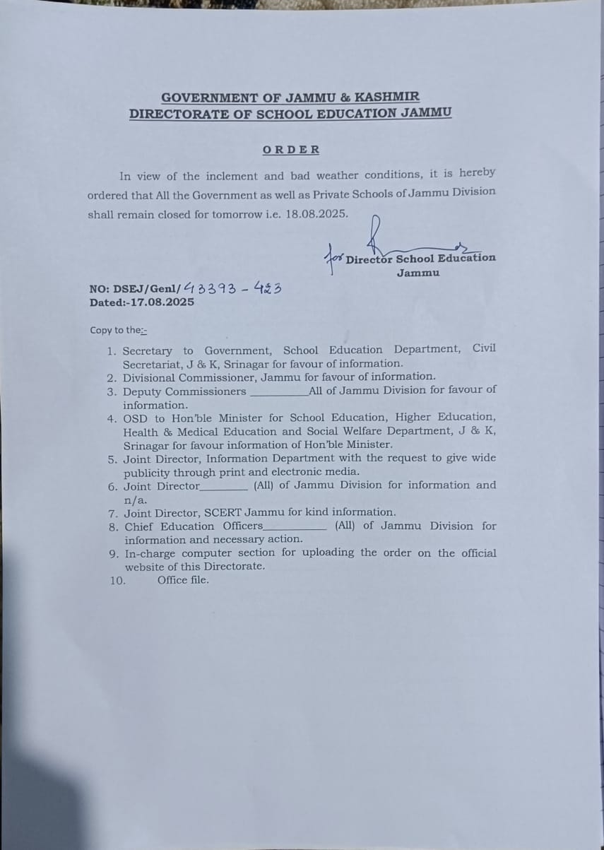 Jammu Division: All schools to remain closed tomorrow amid inclement weather August 17, 2025 No Comments