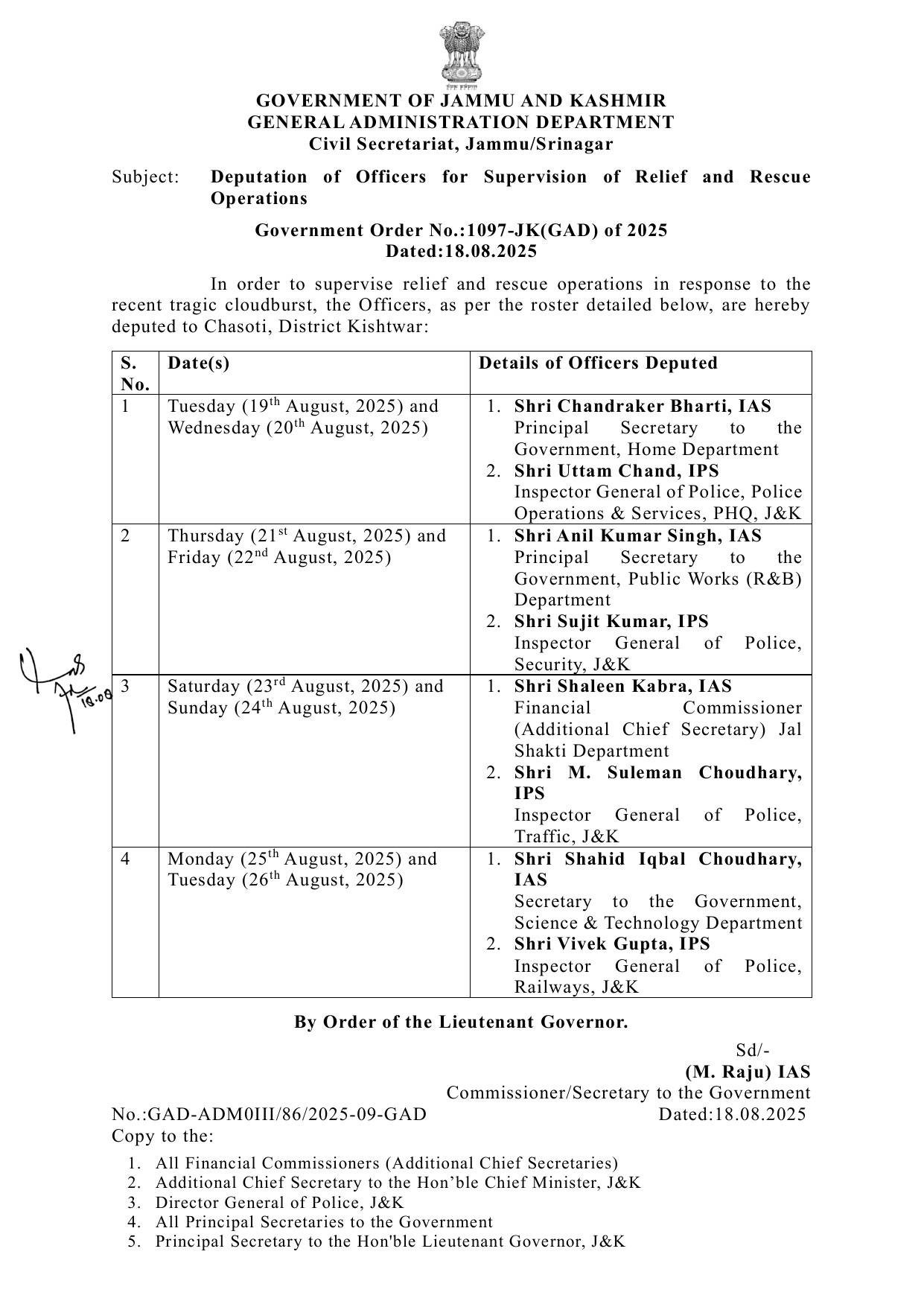 LG Manoj Sinha deputes 8 senior IAS/IPS Officers for relief and rescue Operations in Chasoti, Kishtwar August 18, 2025 No Comments