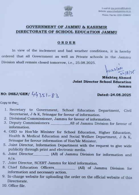 Schools in Jammu Division to remain closed on 25 Aug 2025