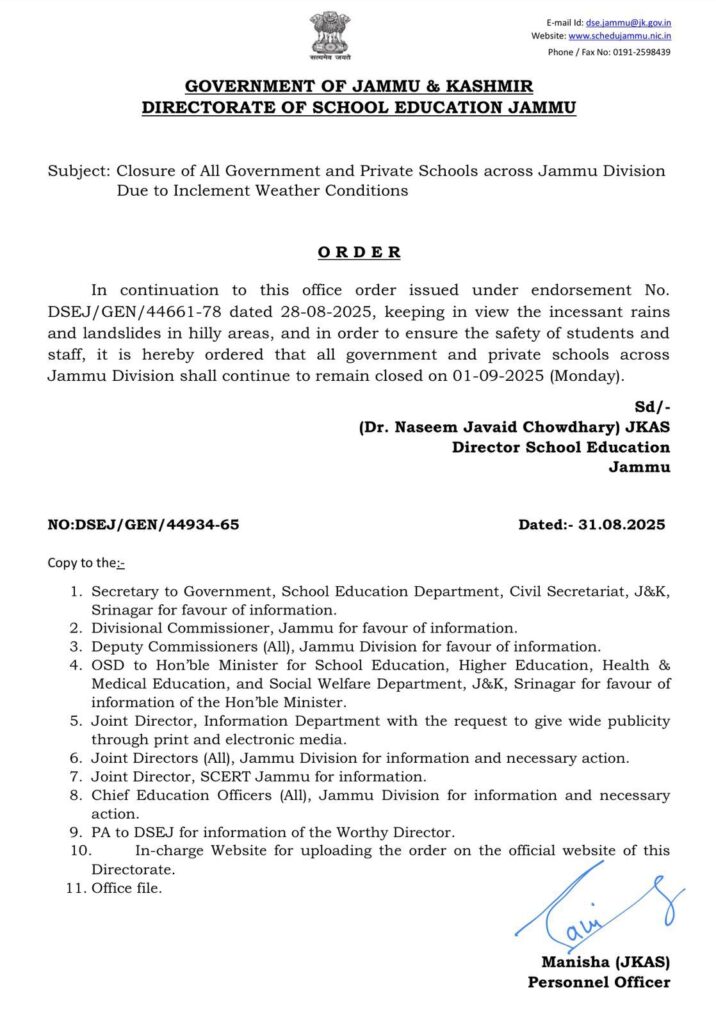 “In continuation of previous orders and considering the ongoing heavy rains and landslides in hilly regions, it is hereby ordered that all government and private schools in Jammu Division shall remain closed on 01-09-2025 (Monday),” the order signed by Director School Education Jammu, Dr. Naseem Javaid Chowdhary, stated.