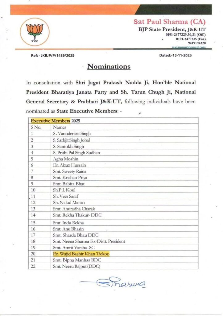 “The newly constituted State Executive reflects the BJP’s commitment to inclusive representation and organizational strength at every level. This team will play a vital role in advancing the party’s mission and strengthening its grassroots network across Jammu and Kashmir,” Sharma said.