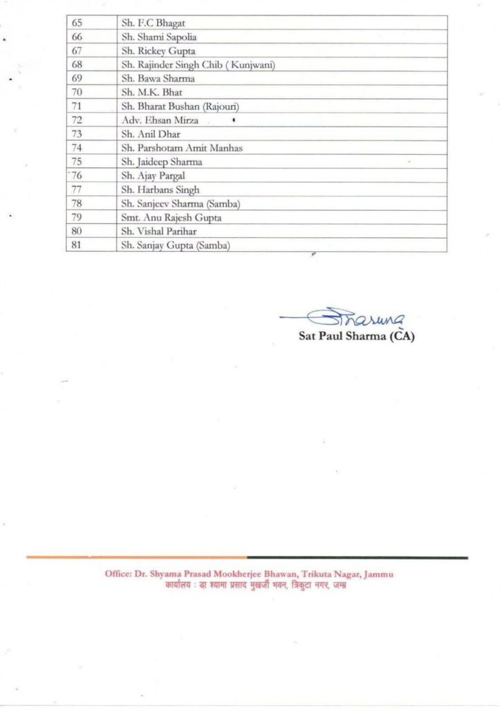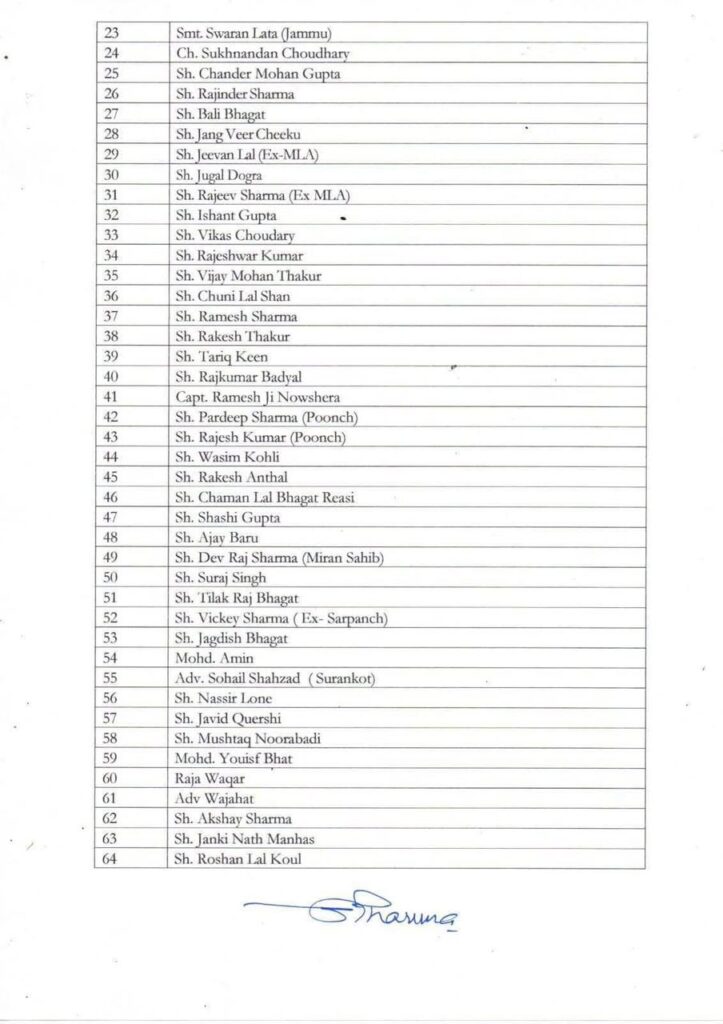 Varinderjeet Singh, Sarbjit Singh Johal, Santokh Singh, Prithi Pal Singh Sudhan, Agha Mohsin, Er. Aizaz Hussain, Sweety Raina, Krishan Priya, Babita Bhat, P. L. Koul, Veer Saraf, Nakul Matoo, Anuradha Charak, Rekha Thakur (DDC), Indu Rekha, Anu Bhasin, Sharda Bhau (DDC), Neena Sharma (Ex-District President), Amrit Varsha (SC), Er. Wajid Bashir Khan Tickoo, Bipna Manhas (BDC), Neeru Rajput (DDC), Swaran Lata (Jammu), Sukhnandan Choudhary, Chander Mohan Gupta, Rajinder Sharma, Bali Bhagat, Jang Veer Cheeku, Jeevan Lal (Ex-MLA), Jugal Dogra, Rajeev Sharma (Ex-MLA), Ishant Gupta, Vikas Choudhary, Rajeshwar Kumar, Vijay Mohan Thakur, Chuni Lal Shan, Ramesh Sharma, Rakesh Thakur, Tariq Keen, Rajkumar Badyal, Capt. Ramesh Ji (Nowshera), Pardeep Sharma (Poonch), Rajesh Kumar (Poonch), Wasim Kohli, Rakesh Anthal, Chaman Lal Bhagat (Reasi), Shashi Gupta, Ajay Baru, Dev Raj Sharma (Miran Sahib), Suraj Singh, Tilak Raj Bhagat, Vickey Sharma (Ex-Sarpanch), Jagdish Bhagat, Mohd. Amin, Adv. Sohail Shahzad (Surankot), Nassir Lone, Javid Quershi, Mushtaq Noorabadi, Mohd. Yousif Bhat, Raja Waqar, Adv. Wajahat, Akshay Sharma, Janki Nath Manhas, Roshan Lal Koul, F. C. Bhagat, Shami Sapolia, Rickey Gupta, Rajinder Singh Chib (Kunjwani), Bawa Sharma, M. K. Bhat, Bharat Bhushan (Rajouri), Adv. Ehsan Mirza, Anil Dhar, Parshotam Amit Manhas, Jaideep Sharma, Ajay Pargal, Harbans Singh, Sanjeev Sharma (Samba), Anu Rajesh Gupta, Vishal Parihar, and Sanjay Gupta (Samba).